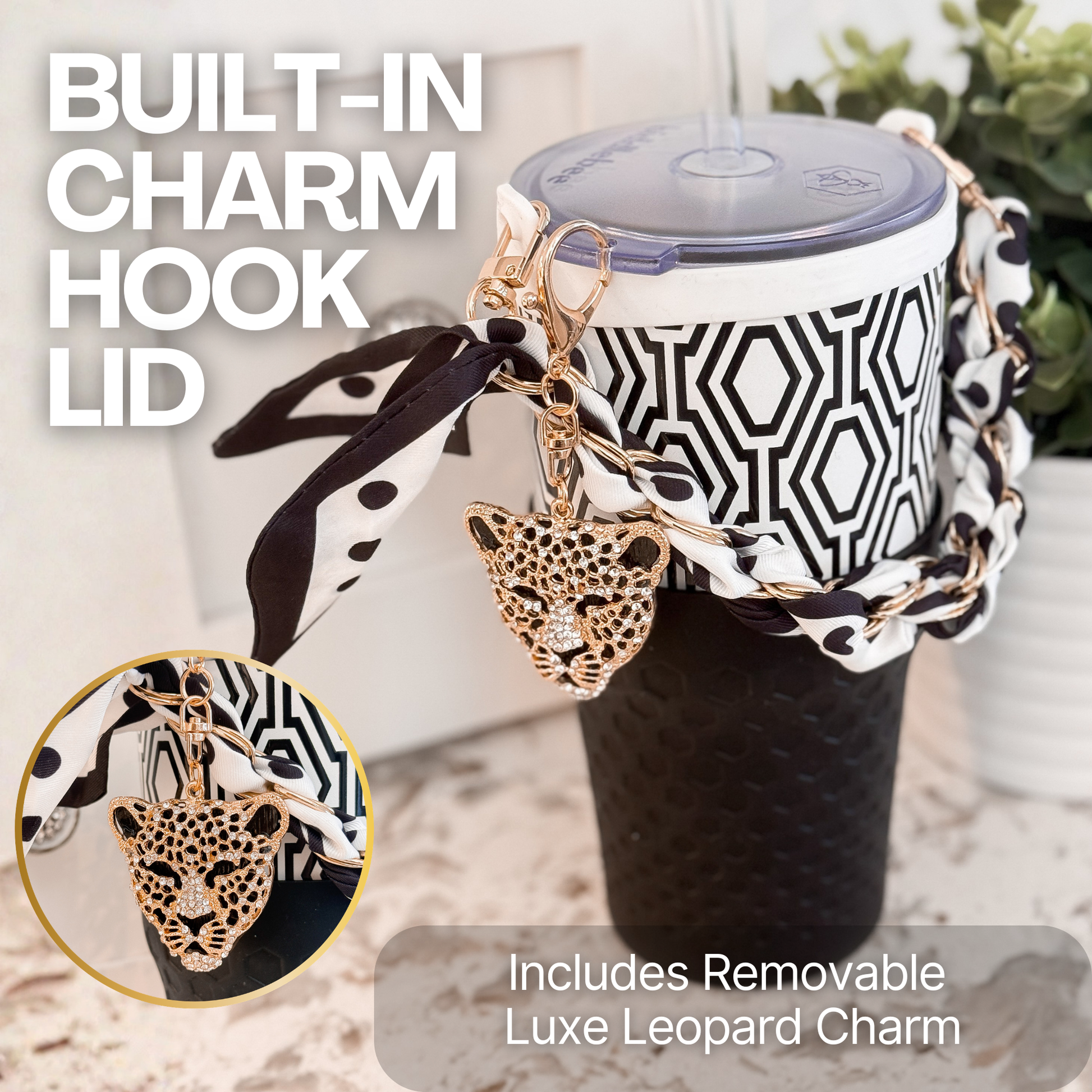 Biddlebee 30oz Black & White Geometric Straw Tumbler – Cup Holder Friendly Luxe Set w/ Leopard Charm & Chain Handle
