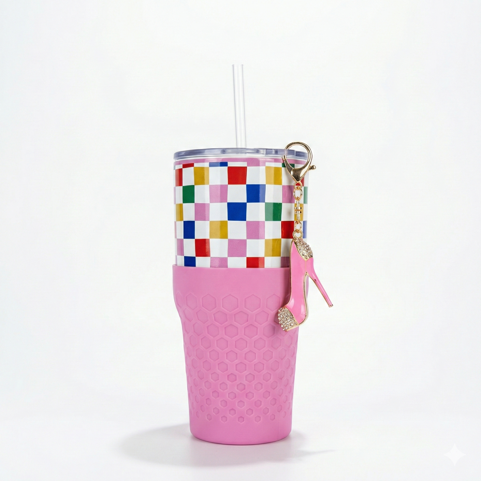 The Biddlebee 30oz Colorful Check Straw Tumbler brings playful color and fashion-forward details together in one must-have hydration accessory. Featuring a bright check pattern, a soft pink silicone boot, and a sparkly pink high-heel charm, this tumbler adds a little glam to your everyday routine.